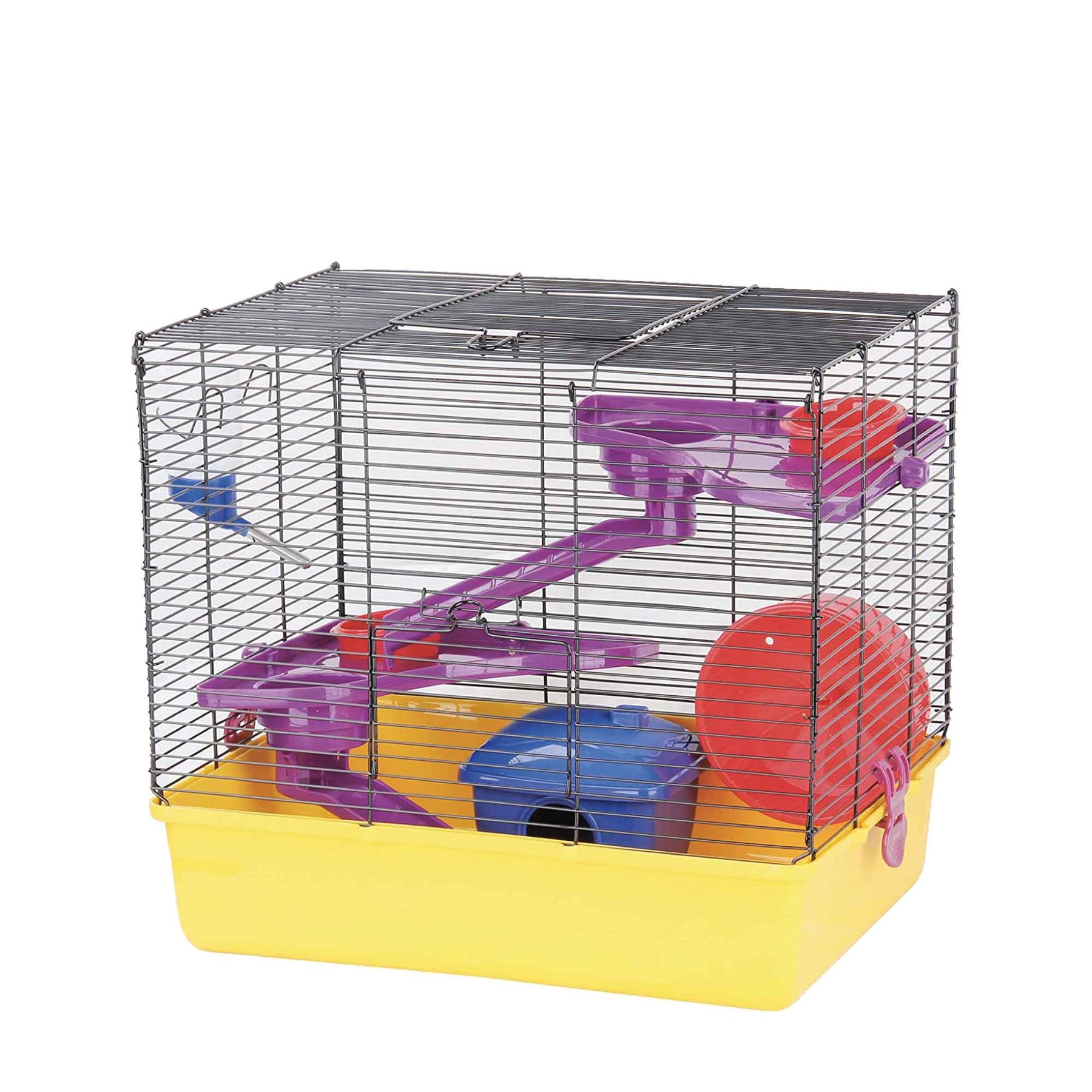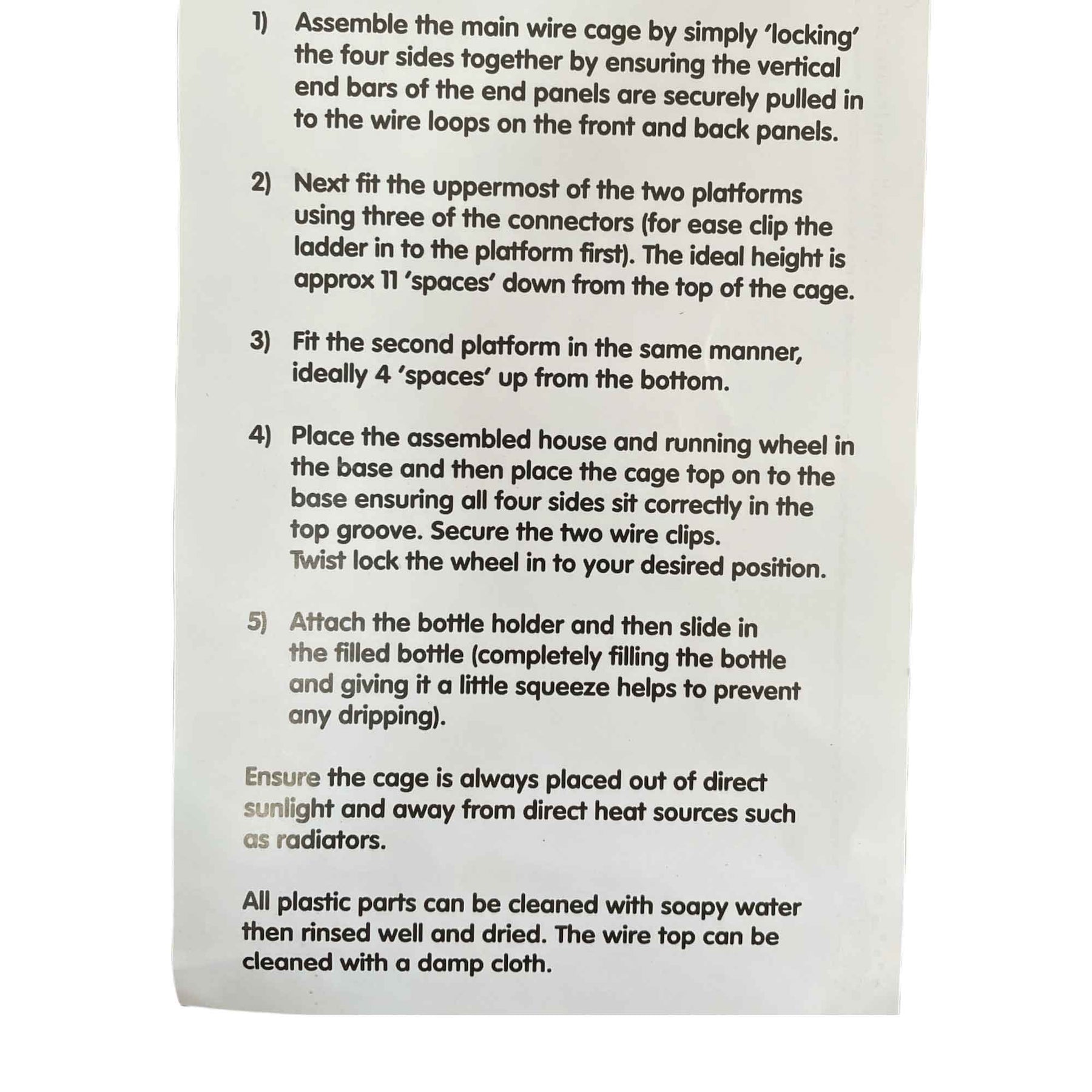 • Includes 2 Platforms, 2 rippled climbing ramps, a plastic wheel, plastic house, hanging water bottle (100ml), and 2 food dishes