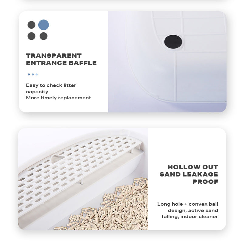 One-Way Door: The front door of the litter box is only used for in and out, to prevent the litter spill outside, the cat could go in and out through the top door at will, which is benefitial to exercising the cat's body and increasing the fun of life. The hollow holes at the top of the litter tray filter the litter, so that when the cat jumps out the litter will fall back into the tray without causing a mess and reducing the number of cleanings.