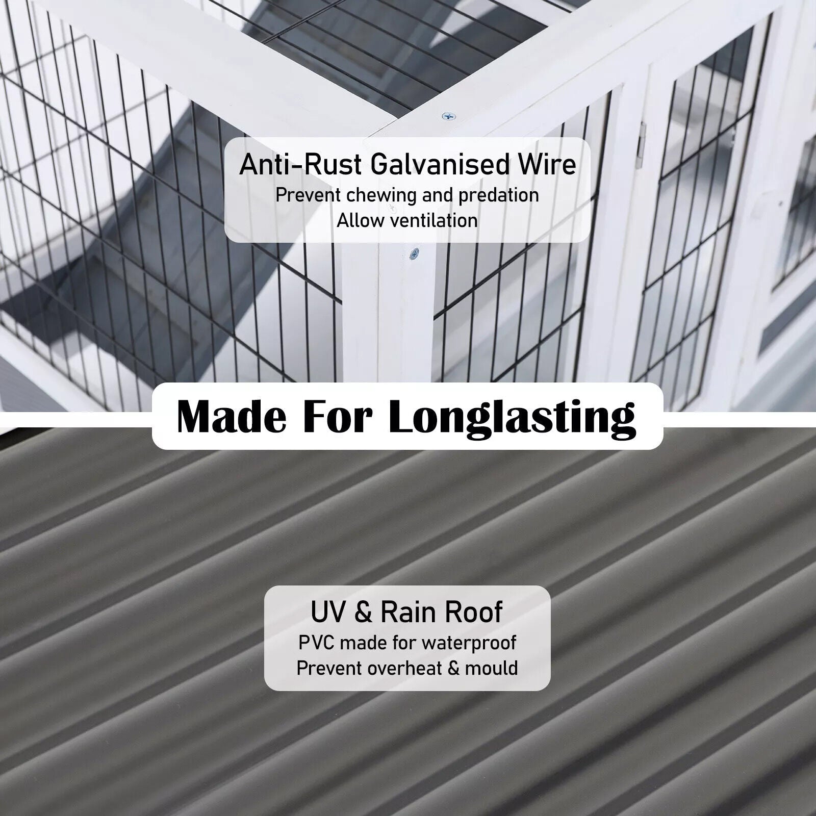 Made from polycarbonate and galvanised mesh wire, our hutch provides a safe and durable space for your pets to rest and exercise. With a double-level enclosure and a ramp to strengthen your pets' muscles, this hutch is designed to meet your pets' needs.