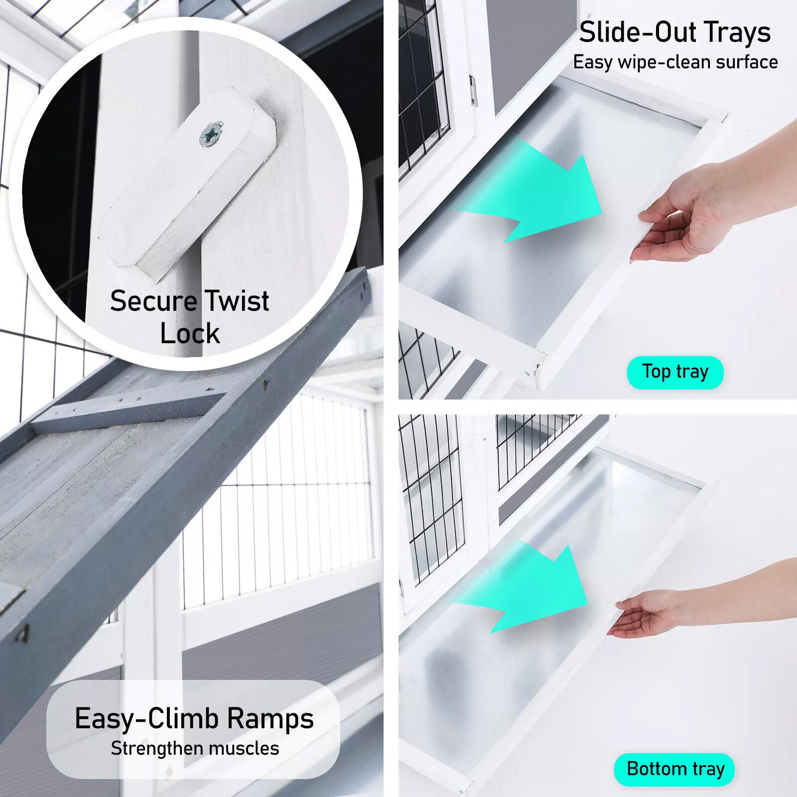 It is crucial to keep pets cool to prevent heat stress, especially if they live outdoors. Our hutch is designed to keep pets cool, and it features a well-insulated and weatherproof PVC roof that can withstand extreme weather conditions. Additionally, the hutch provides convenience and security with a pull-out tray for quick cleaning and several lockable doors for safeguarding and easy access.