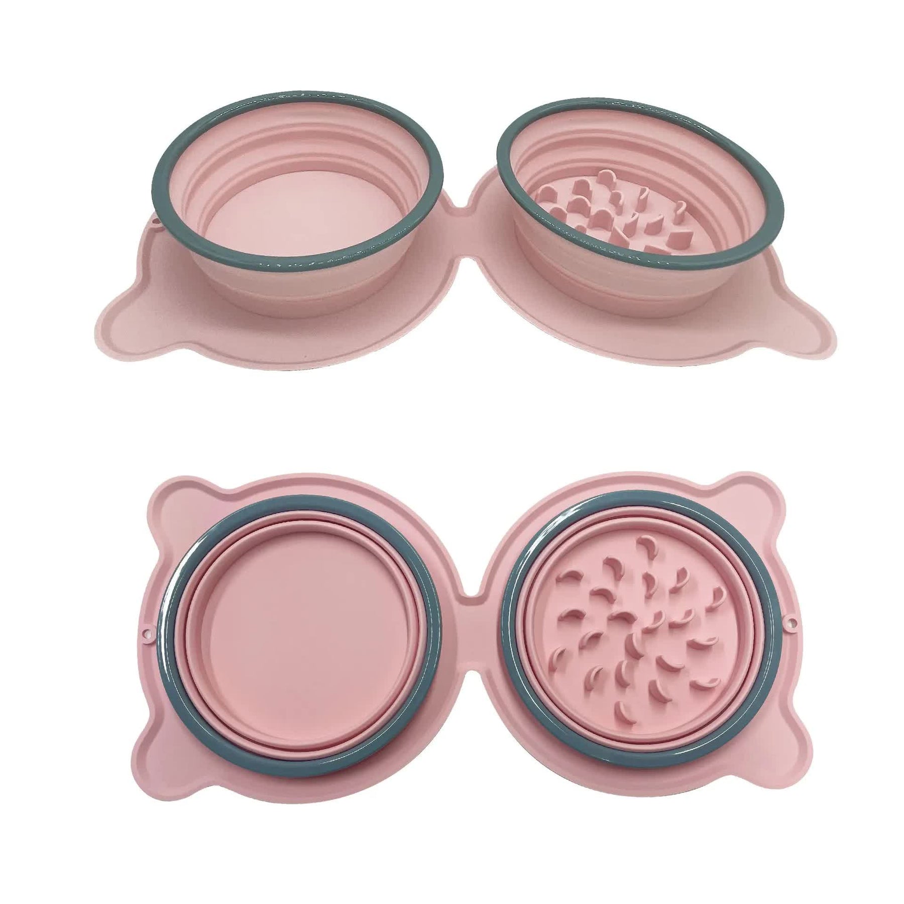 Pink Portable Collapsible Pet Bowl Set - Food-Grade Silicone Double Bowl for Dogs & Cats, Anti-Slip & Easy to Clean