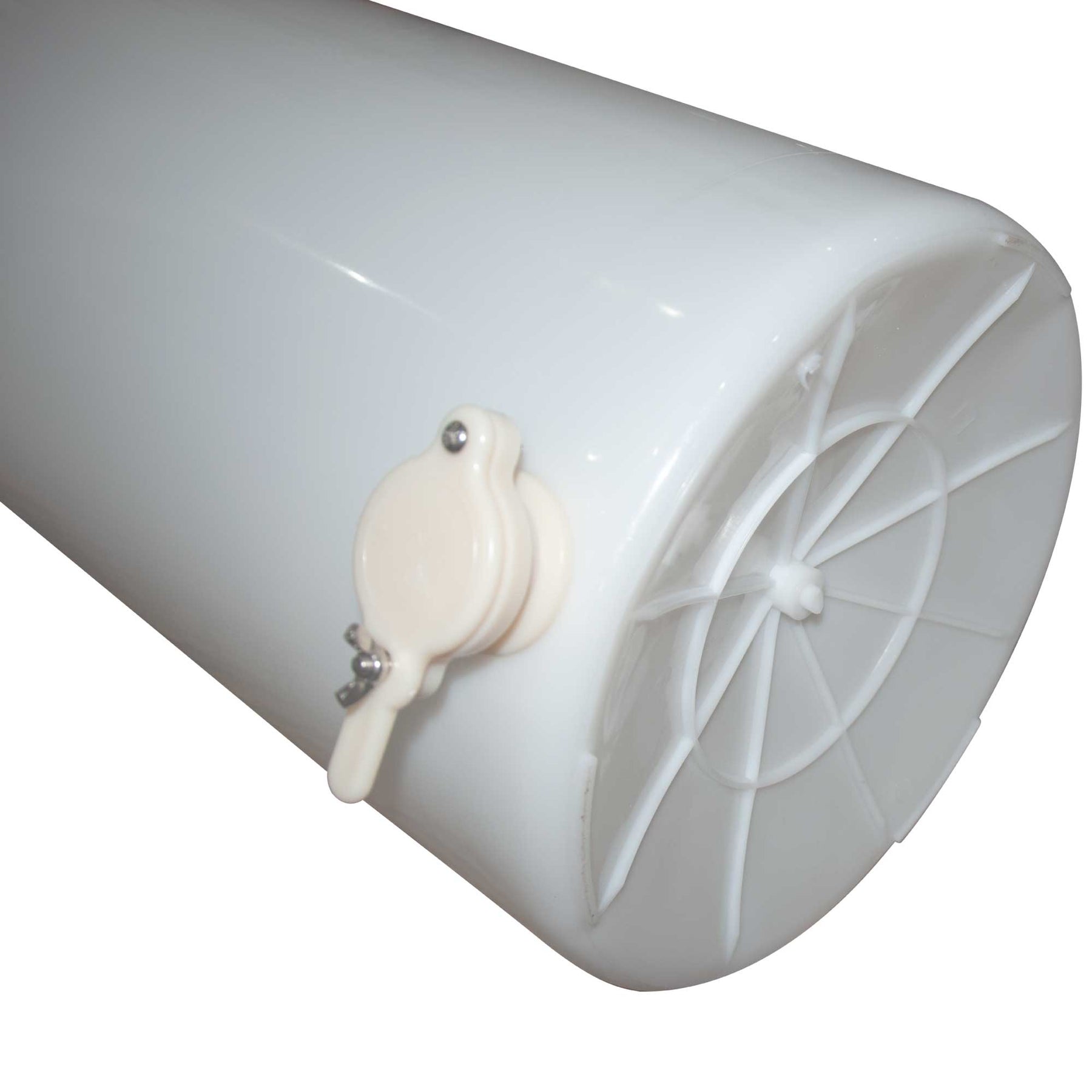 The hand-cranked model is constructed with a heavy food grade plastic, except for a steel centre shaft. It includes a plastic tank, cover and honey gate. Holds two frames of any size. The drum is 70cm tall with a 40cm diameter.