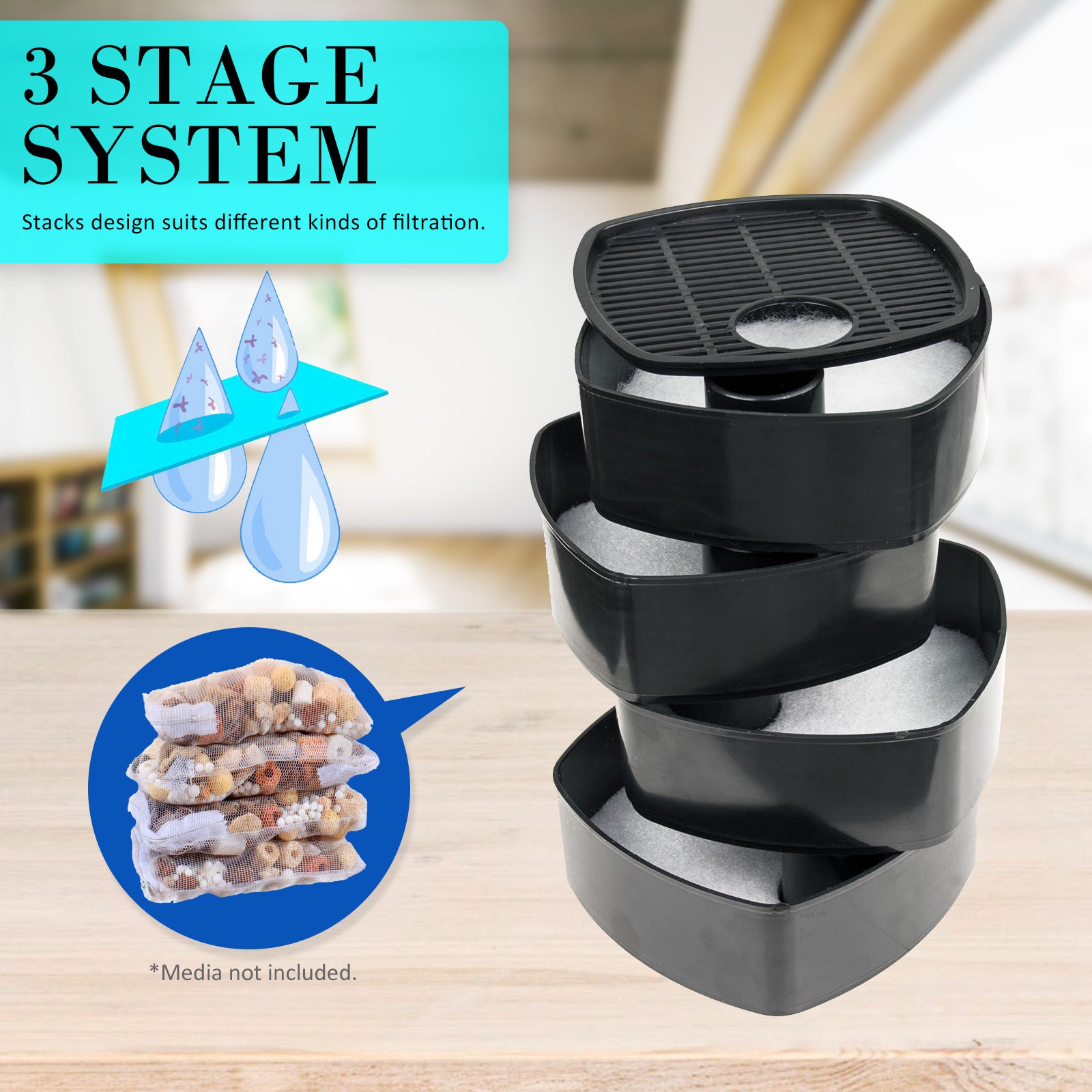 The amazing multi-level filter is capable of offering you the best filtration system as it can hold large quantities of mechanical, biological and chemical filtering materials! The 4 filtration baskets comes with handy handles and allow you to make many different filtering combinations, hence, they give you more flexibility and control over the quality of the water of your tank. The ideal filtering materials are sponge, ceramic noodles, bio balls and carbon.
