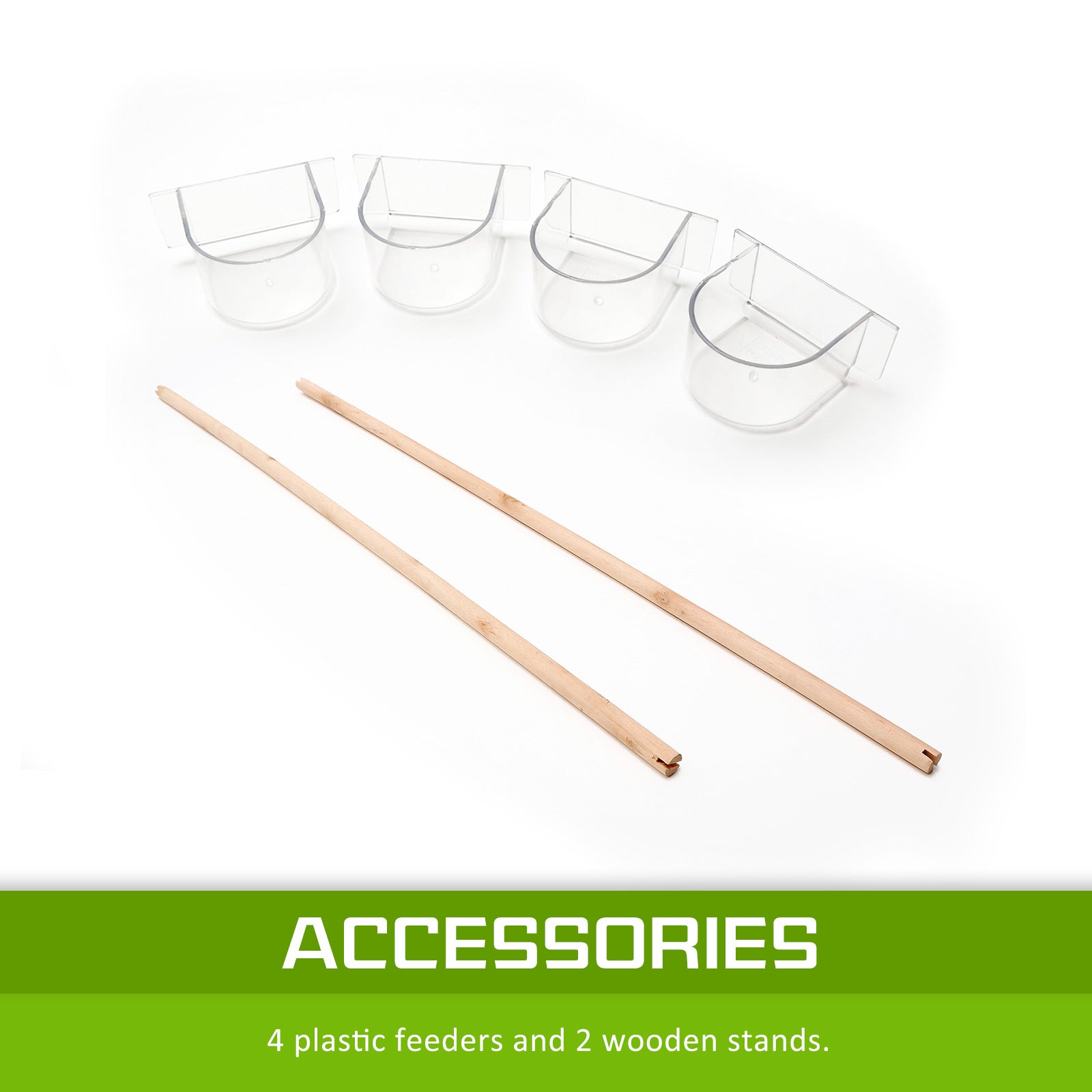 The cage's frame is made of durable and high-quality wrought iron and it is powder coated in order to prevent it from rusting and offer a longer service life. There is one lockable door so you can keep your bird safe and have easy access inside the cage. There is also a removable tray under in order to make cleaning easy. There are four, 360 degree swivel caster plastic wheels so relocating the birdcage is very easy. 4 plastic water/food container and 2 rest wooden perches are included. The cage also has a clever shelf under it so you can store your birds' needs, such as water, food and cleaning tools.