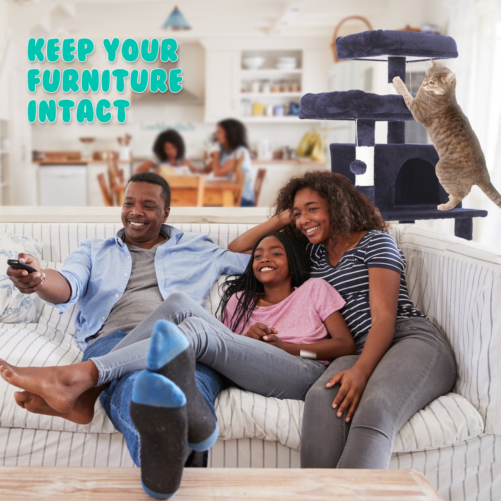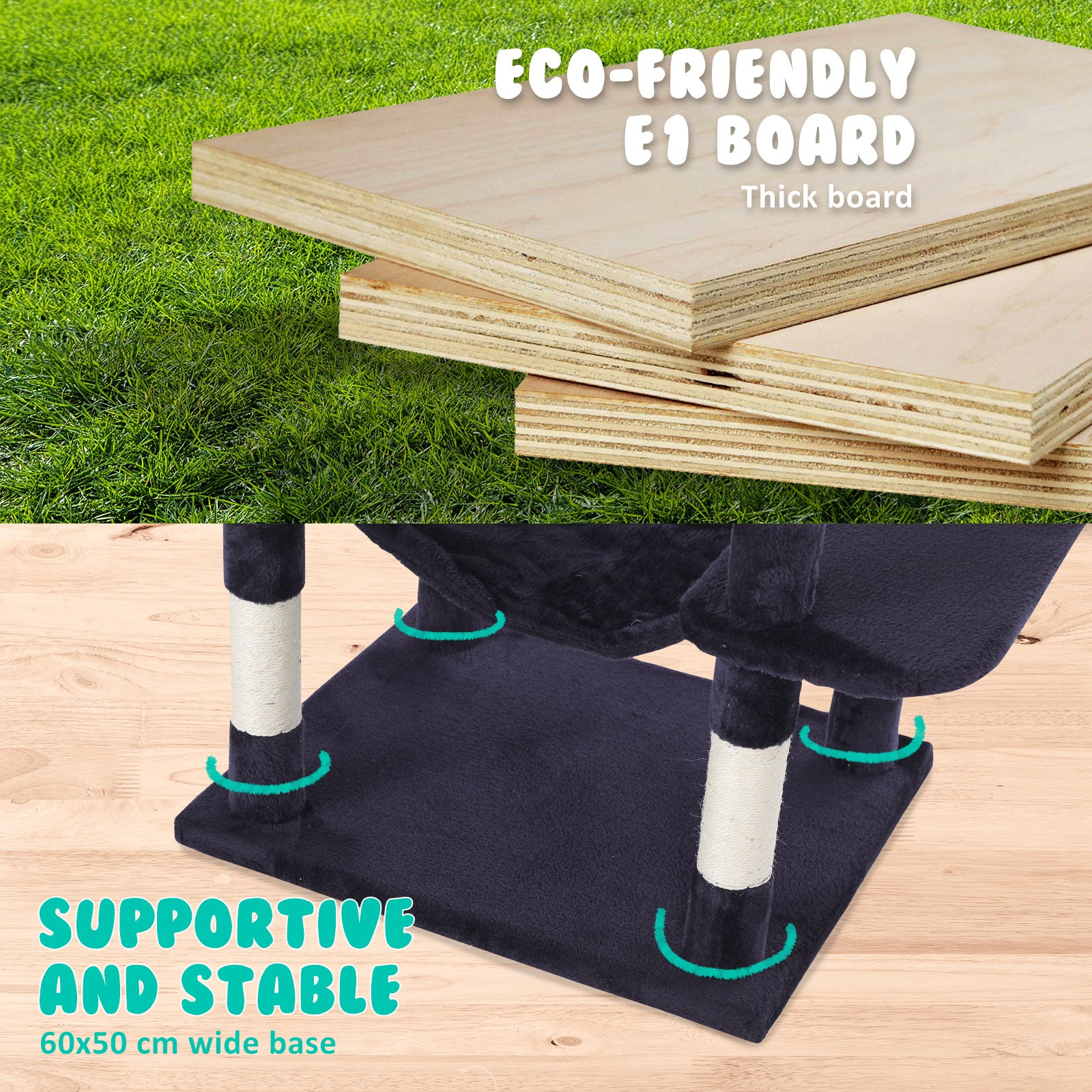 To satisfy your cat's natural instincts and keep your furniture intact, our cat tree comes with durable sisal-wrapped posts to heal your cat's scratching urge and fluffy pom-poms to acquire their thrill of hunting.