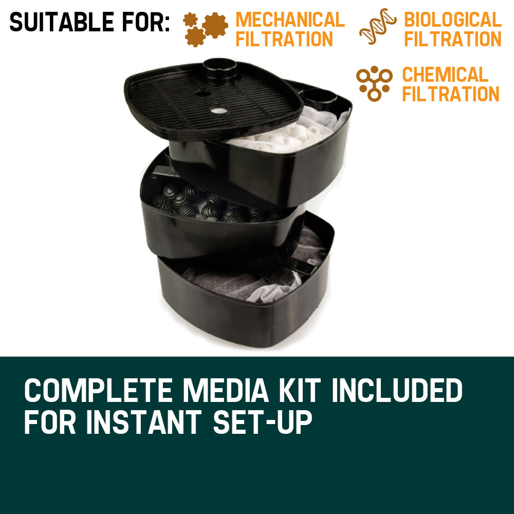 Chemical Filtration - Adding activated carbon and resins will remove various pollutants including dissolved organic compounds and keep the water crystal clear without odour. Effective at removing impurities such as copper, chlorine, dissolved proteins, medications, tap water & impurities. Perfect for sensitive fish and invertebrates.